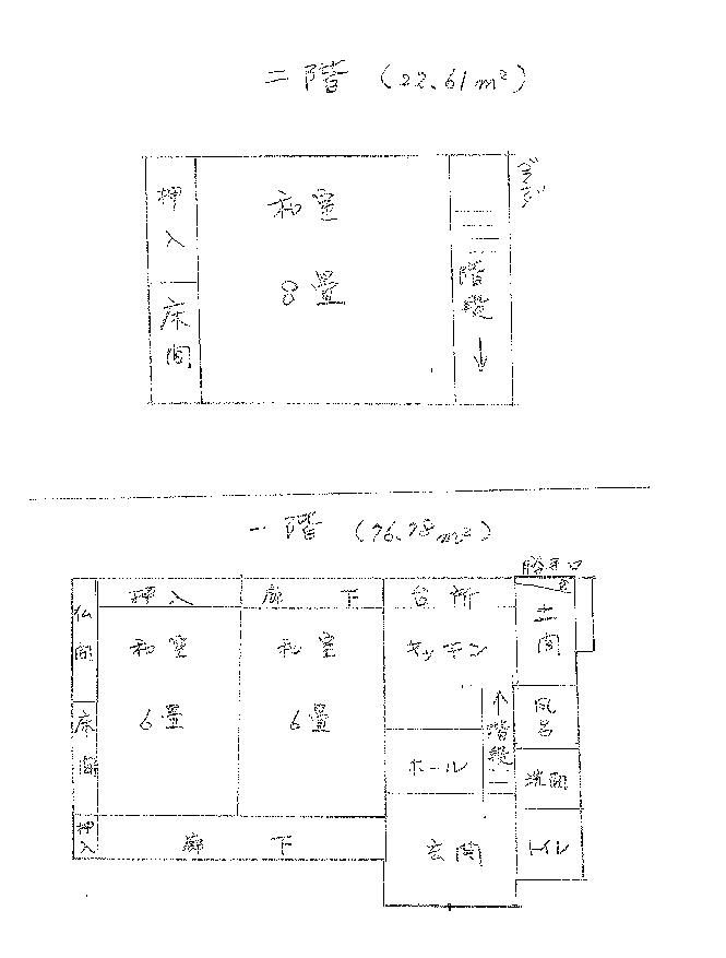 1階6畳2間、台所リビング6畳、2階8畳1間